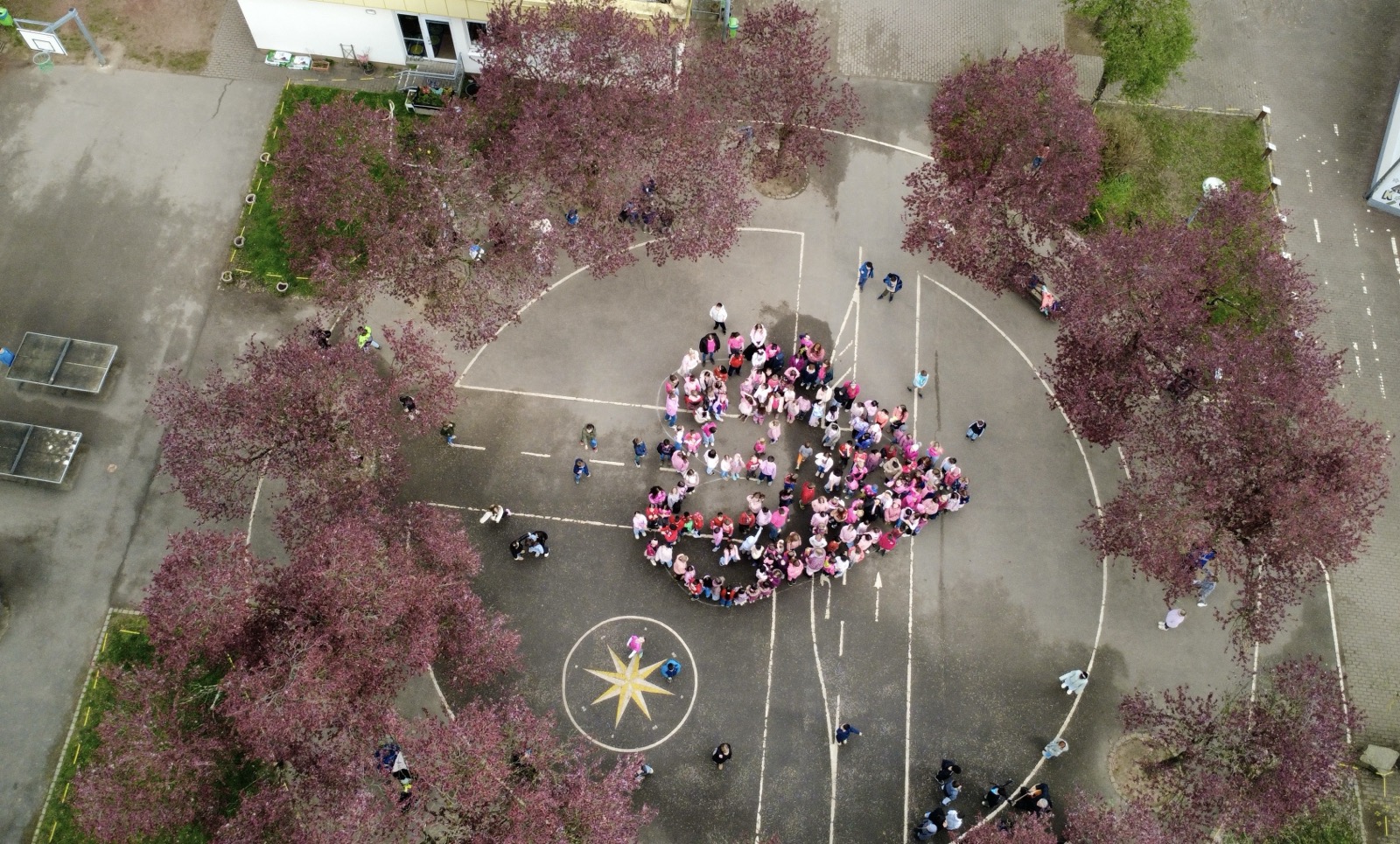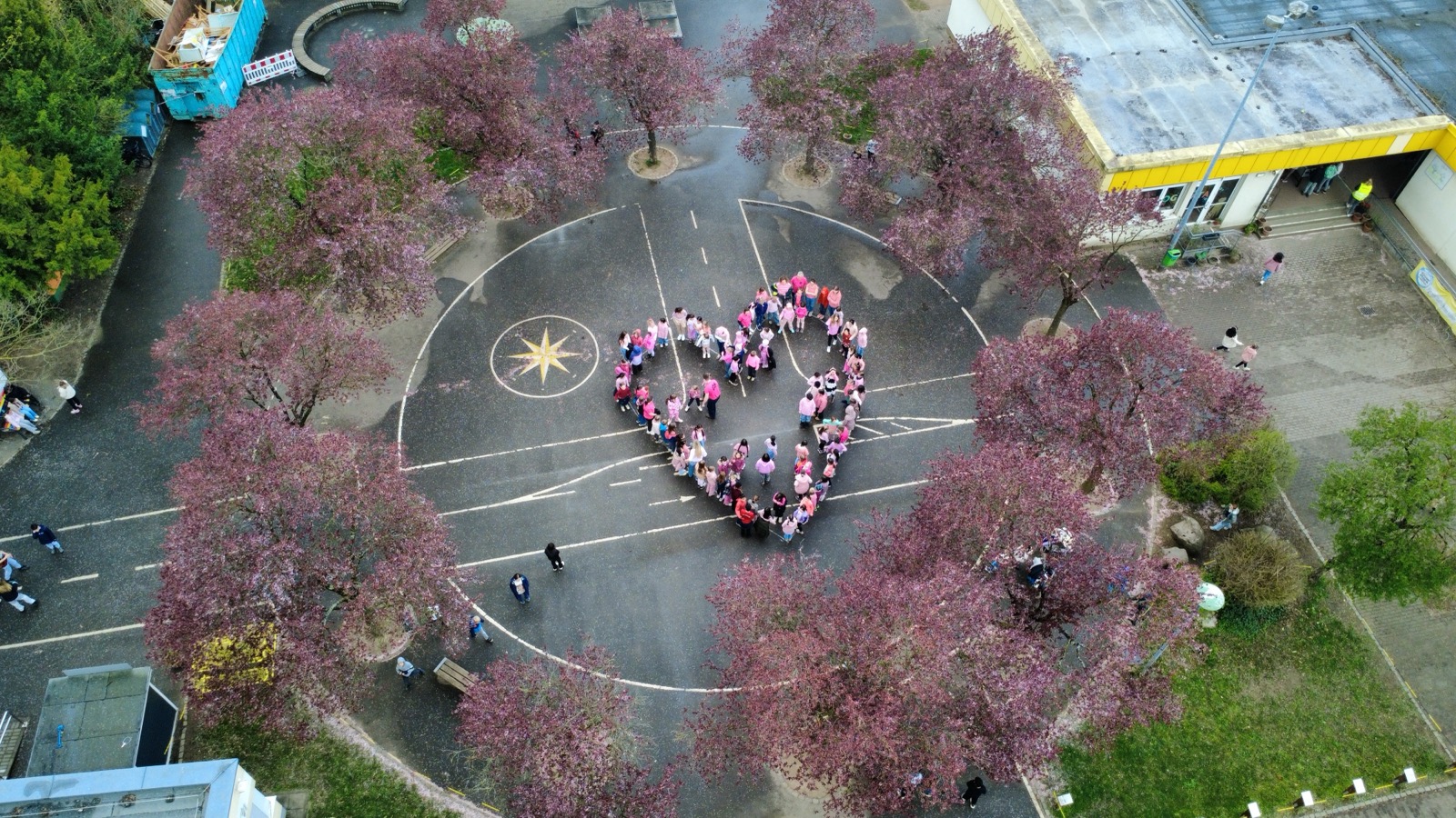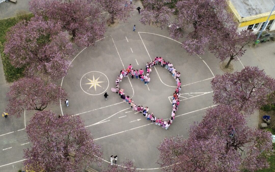 In der Woche vom 23.04.2026 bis 27.04.2026 haben wir jeden Tag gemeinsam ein Zeichen gesetzt. Zu Beginn der großen Pause trafen sich Kinder und Lehrkräfte auf dem Schulhof und bildeten zusammen ein großes, pinkes Herz. Jeden Tag wurden es mehr Teilnehmerinnen und Teilnehmer.