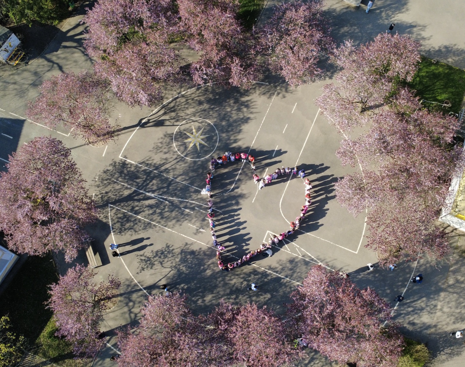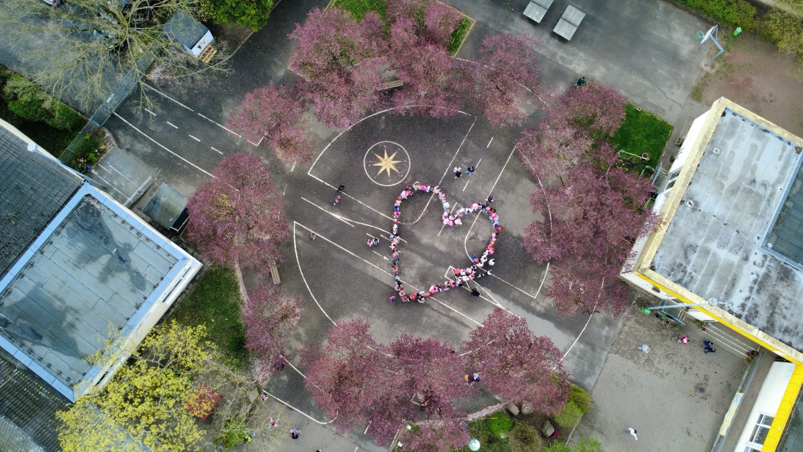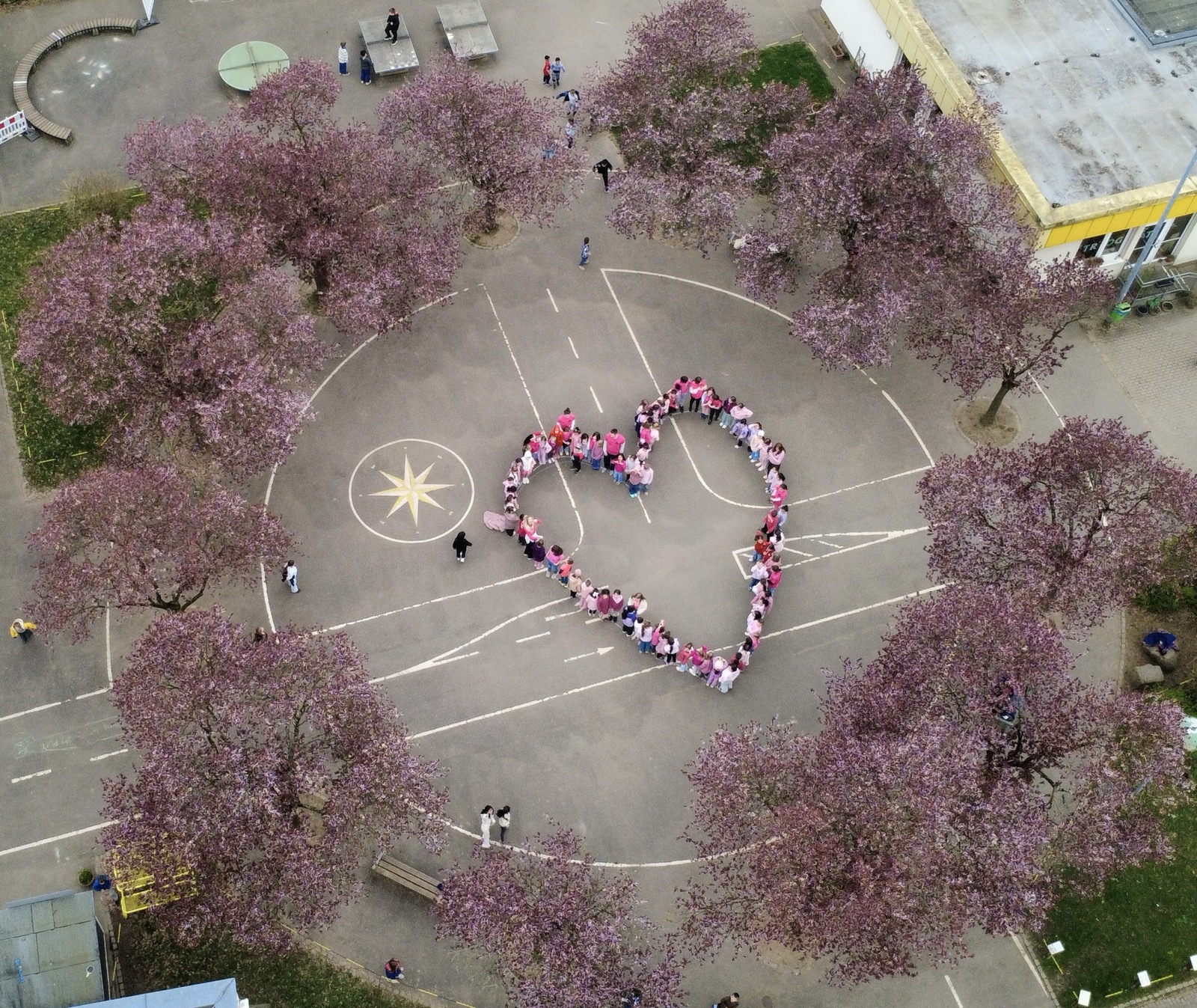 In der Woche vom 23.04.2026 bis 27.04.2026 haben wir jeden Tag gemeinsam ein Zeichen gesetzt. Zu Beginn der großen Pause trafen sich Kinder und Lehrkräfte auf dem Schulhof und bildeten zusammen ein großes, pinkes Herz. Jeden Tag wurden es mehr Teilnehmerinnen und Teilnehmer.